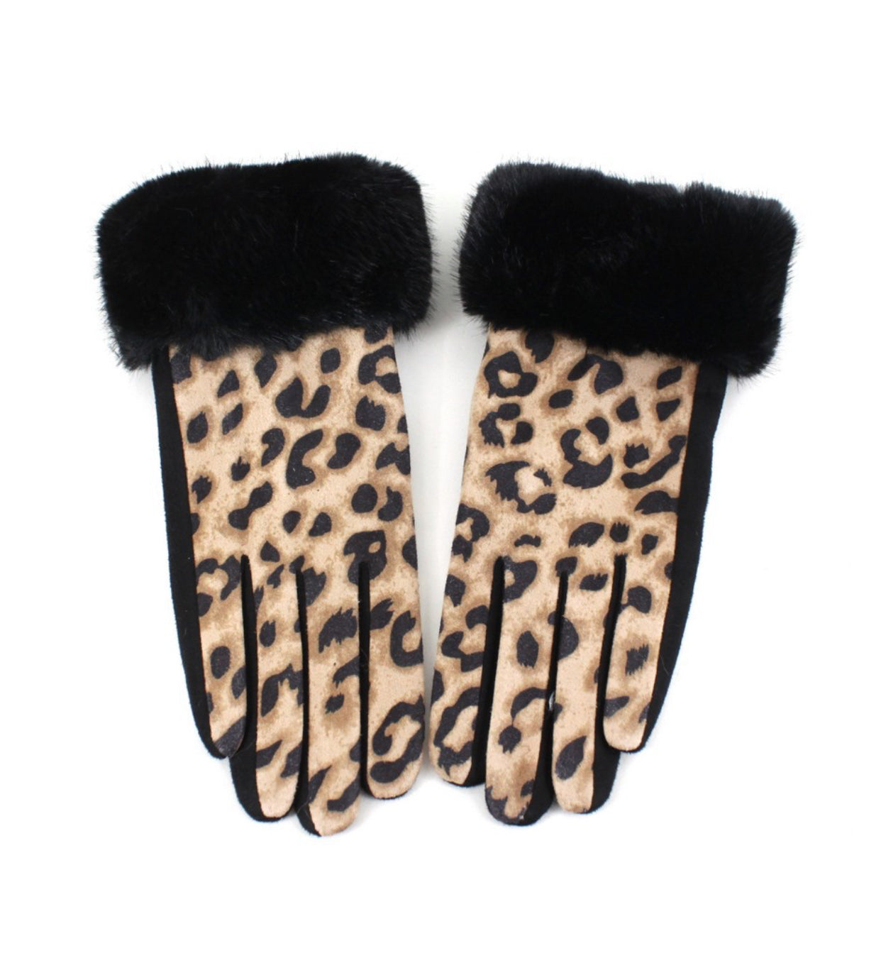 Gloves Leopard Faux Fur Cuff / Beige Black