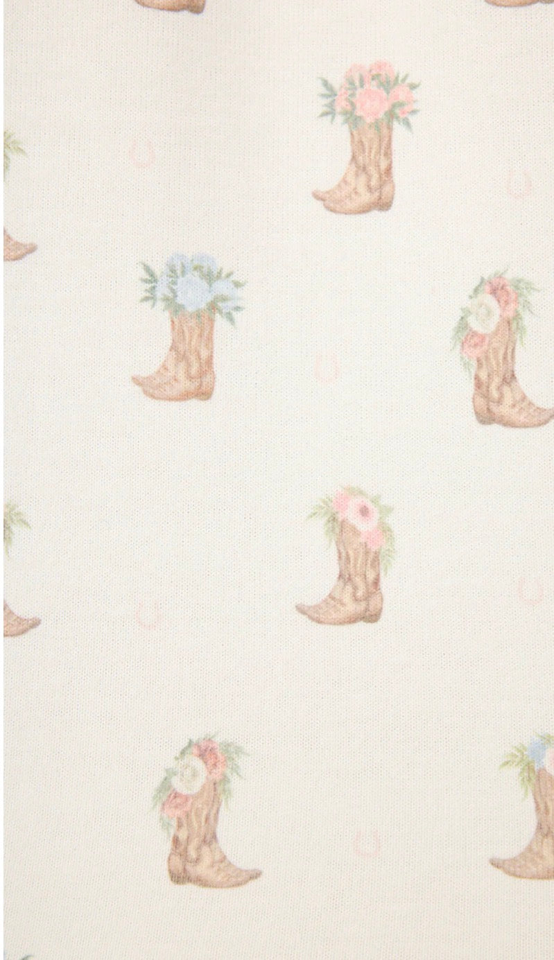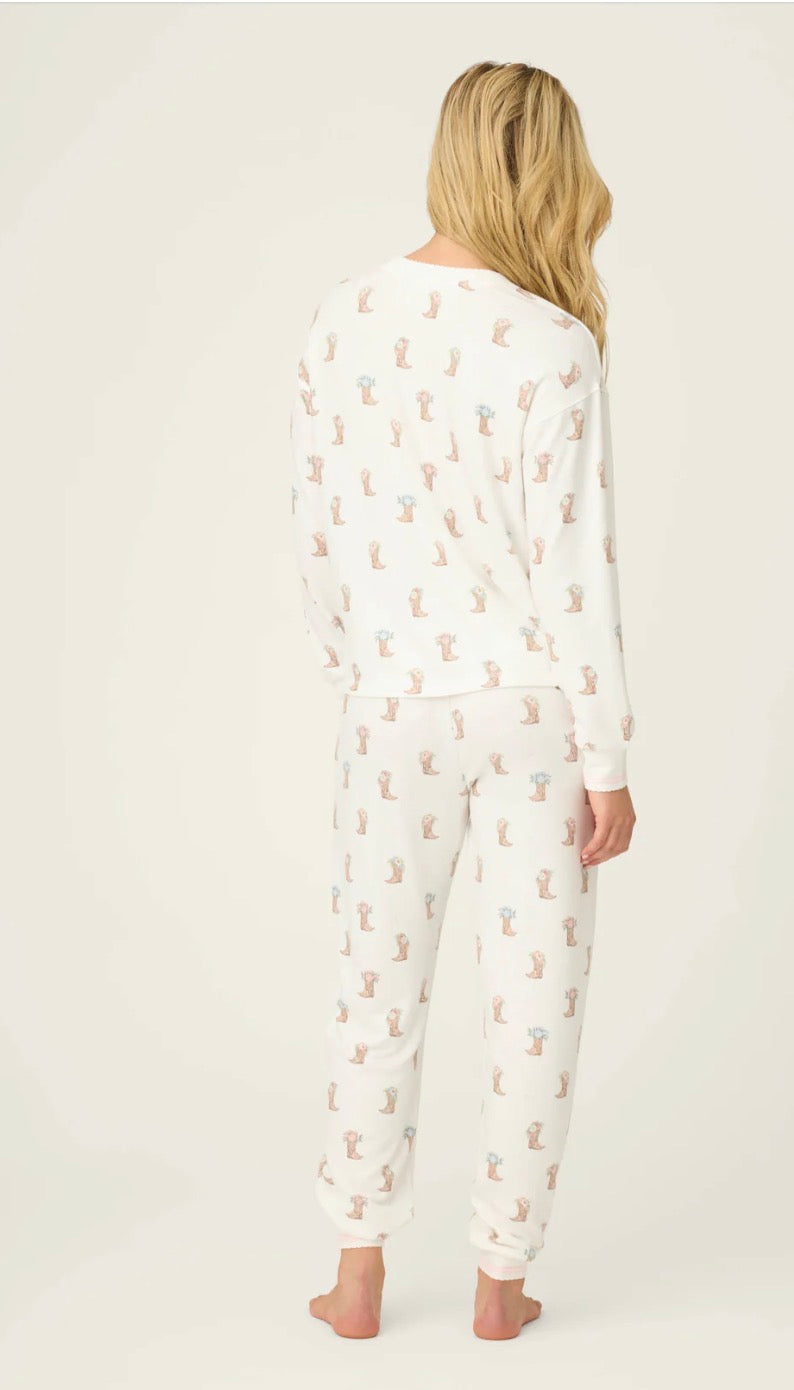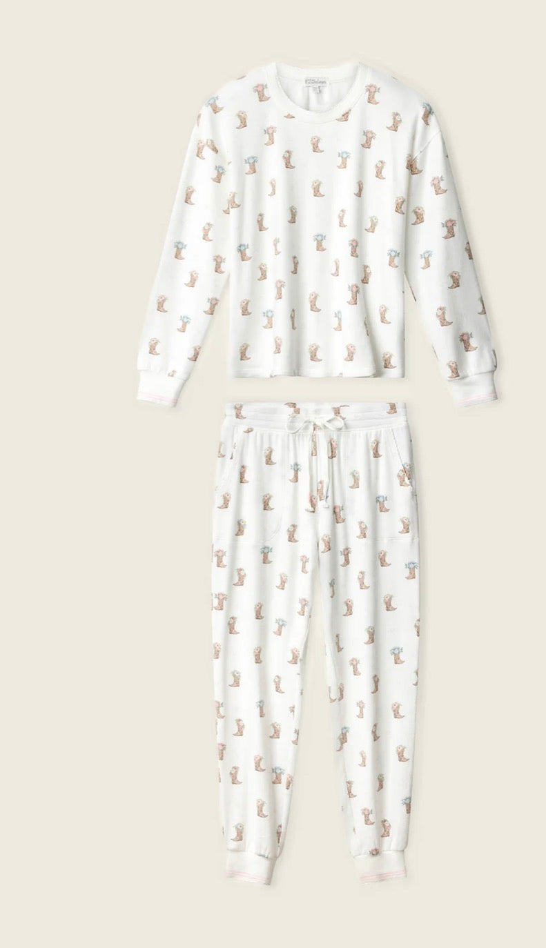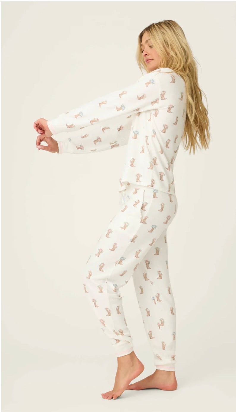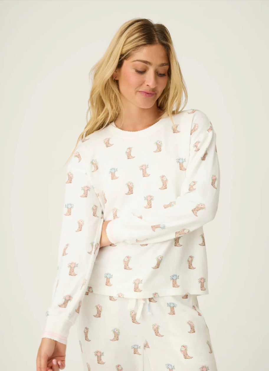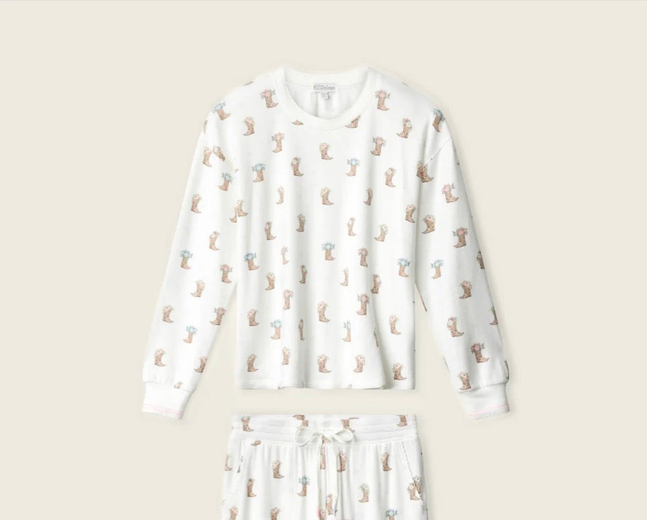 Saddle up for sweet dreams in this pajama lounge set, crafted in peachy-soft jersey and sprinkled with illustrated cowboy boots topped with delicate floral details. The relaxed long-sleeve top pairs perfectly with matching drawstring pants, finished with a comfy elastic waistband and scalloped trim for a soft, feminine touch. Made for slow mornings, lazy lounging, and kicking your boots off early.