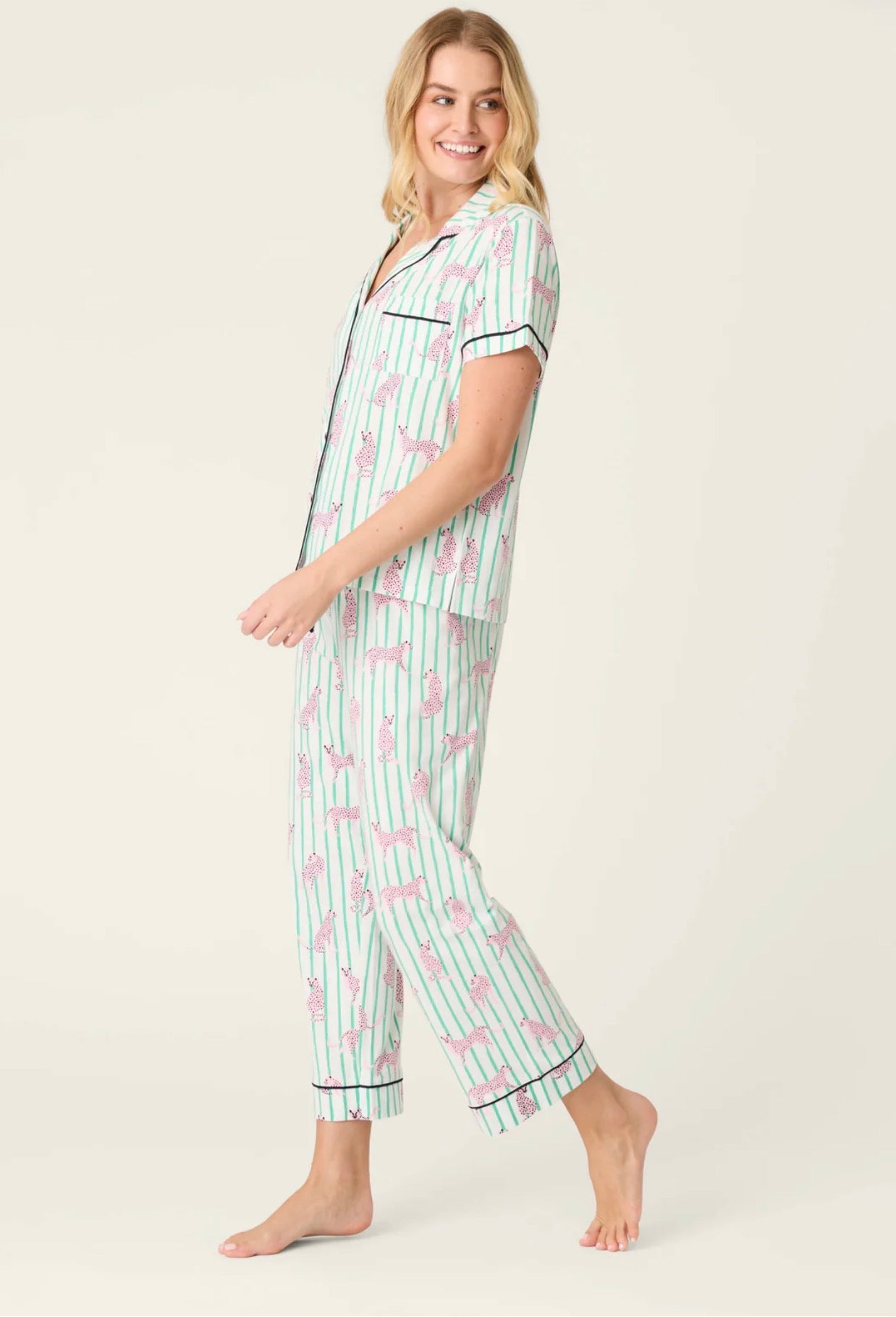 Women’s mint green pajama set featuring a short-sleeve button-down top with contrast piping, chest pocket, and matching pants with an elastic waistband and adjustable drawstring. Made from a soft cotton-modal jersey with a striped jaguar print.