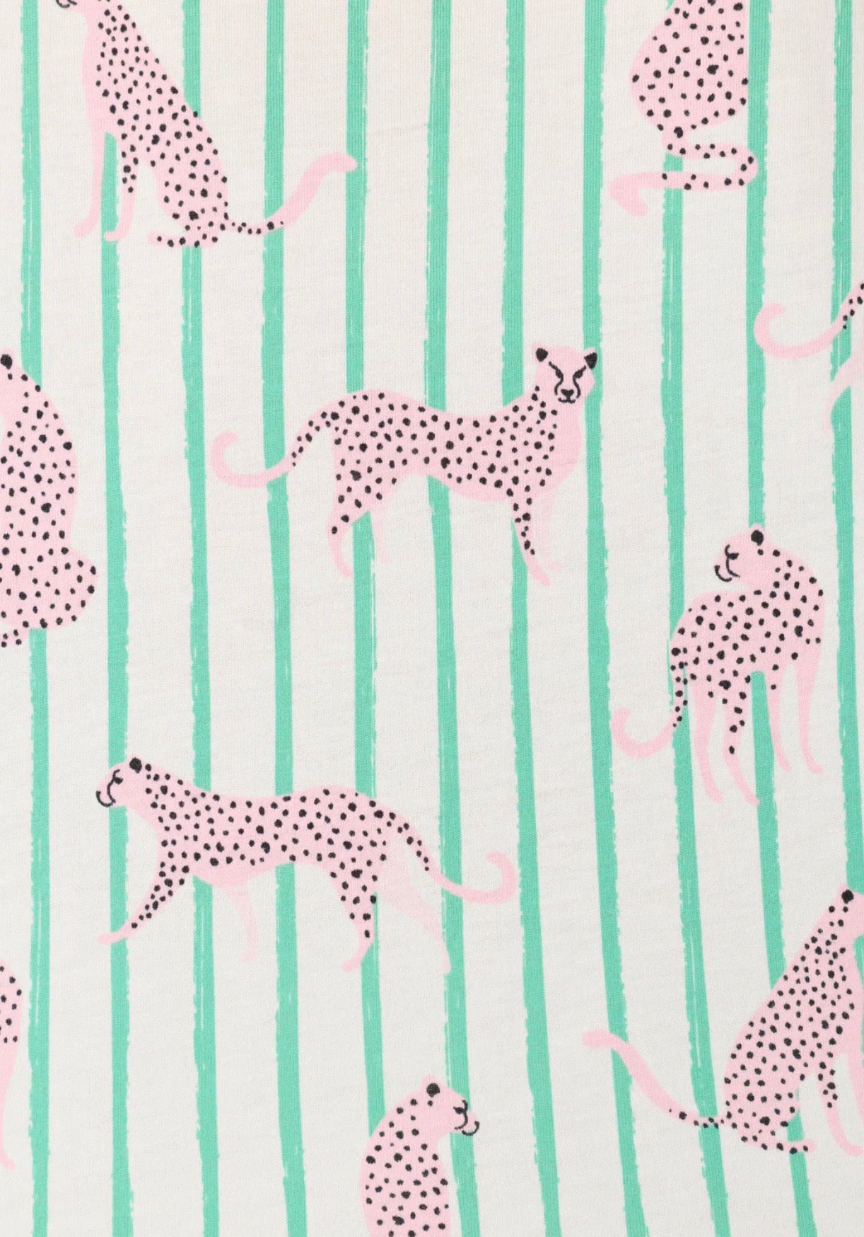 Fresh stripes meet playful jaguars in this standout pajama set designed for sleep-ins and slow mornings. The short-sleeve button-down top features contrast piping and a chest pocket, paired with matching pants finished with an elastic waistband and adjustable drawstring for all-night comfort