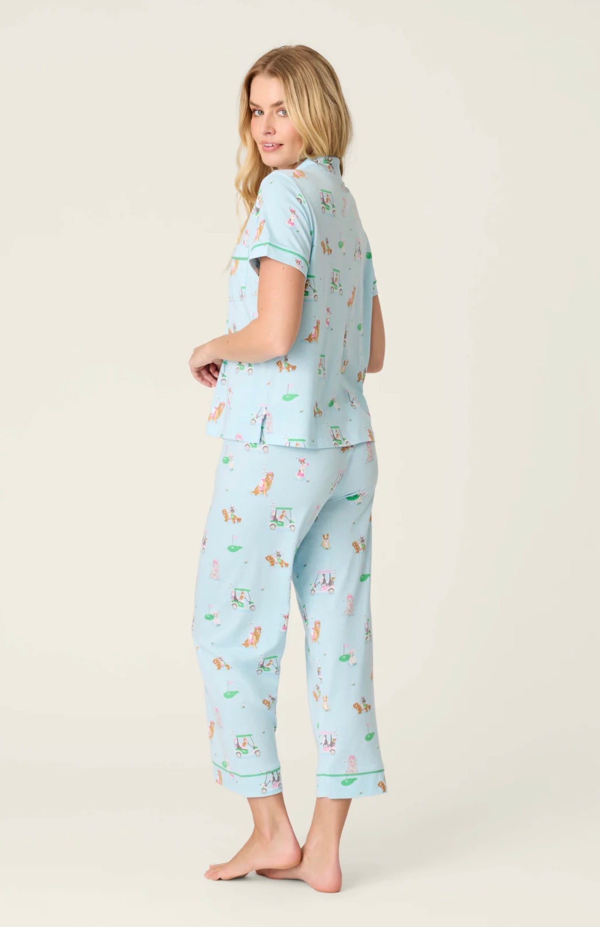 Playful and lighthearted, this pajama set features dogs hitting the green across a soft light blue backdrop. The short-sleeve button-down top is finished with contrast piping and a chest pocket, while the matching pants feature an elastic waistband and adjustable drawstring for easy comfort from bedtime to morning coffee.