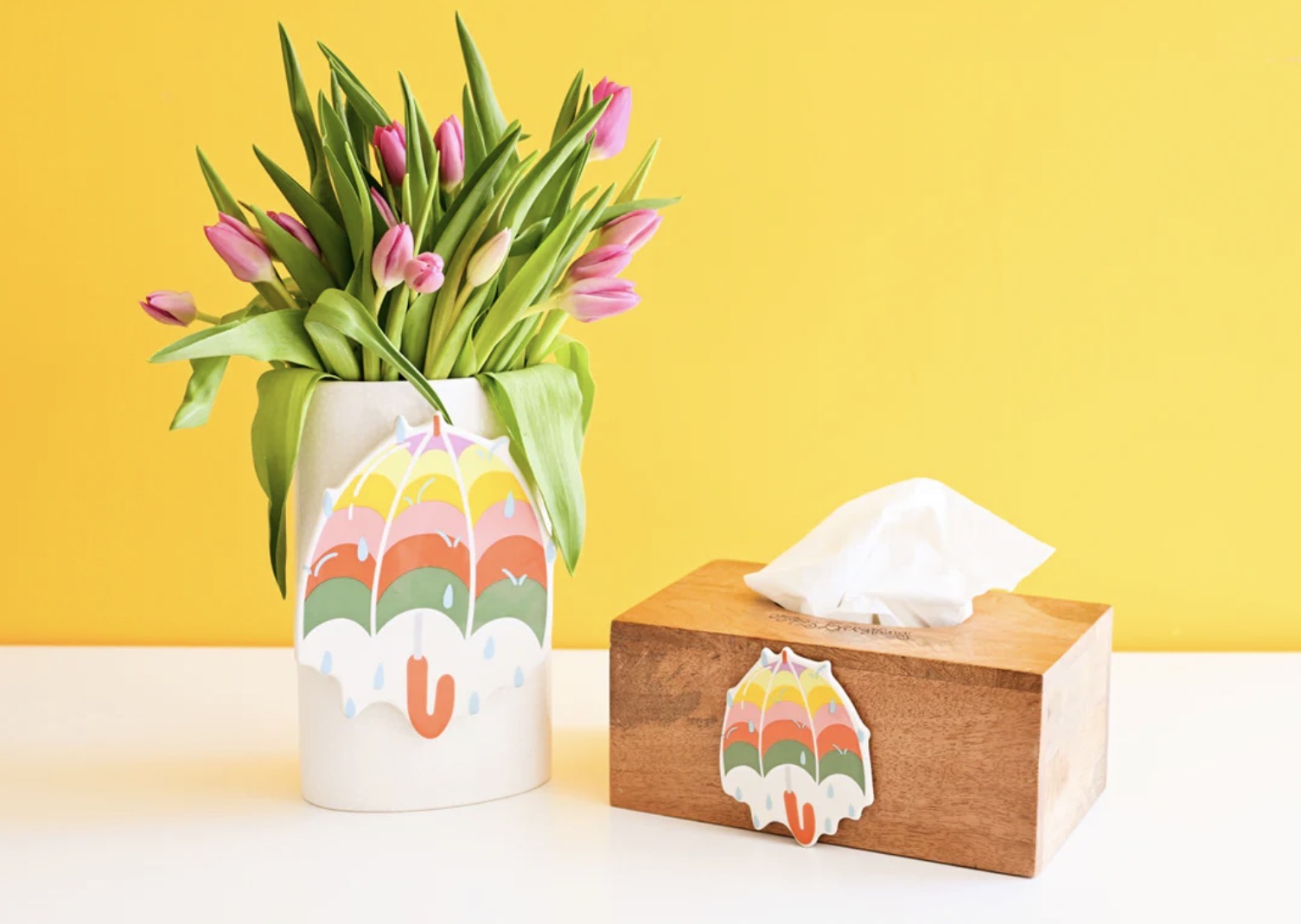 Rain, rain, go away, and bring happy back another day with our Drip Drop Umbrella Mini Attachment. When the weather gets dreary, interchangeable décor is the secret to adding cheer to your home. Attach this bright design to your Mini Tissue Box or Mini Platter and let the colors brighten up your inside while the grey sky looms outside.