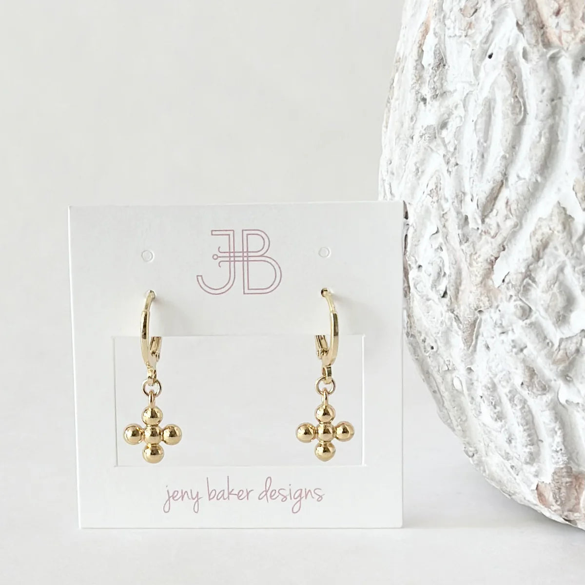 - Small gold ball cross charms on gold huggies