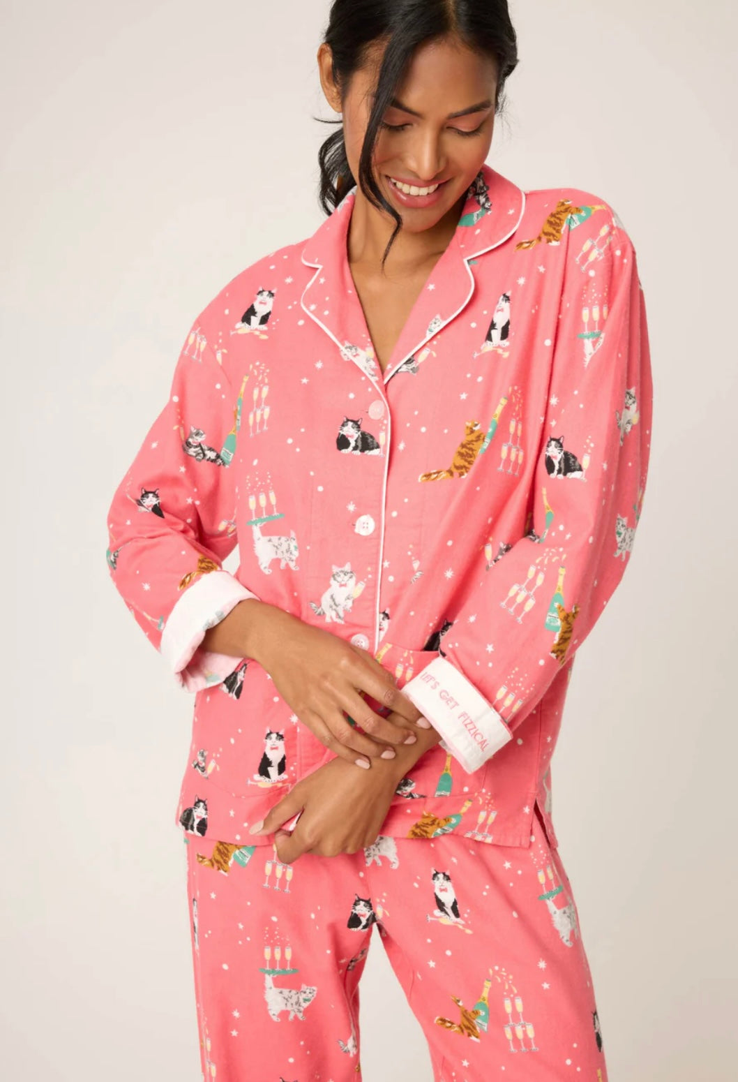 Feel-ine festive, this three-piece flannel set is made from soft cotton in a classic twill weave, complete with a button-front top, relaxed drawstring pants, and a matching headband. The coral backdrop is covered in cats sipping champagne and clinking flutes, finished with contrast piping and a cuff that cheekily reads “Let’s Get Fizzical”—purr-fect for holiday lounging, bubbly nightcaps, and curling up for a catnap.
