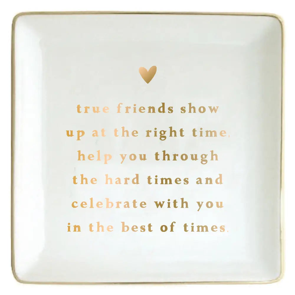True Friends - Trinket Tray This square Trinket Dish is the perfect gift for that BFF who has always been there for you. Featuring beautiful gold lettering and a tiny heart with the words: "true friends show up at the right time help you through the hard times and celebrate with you in the best of times " Place it on the dresser, vanity, or nightstand to keep treasured rings and small jewelry items safe. -great gift -4"x4" square -ceramic with gold foil -not food safe