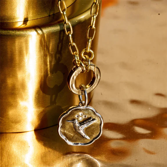 Hummingbirds have long been associated with messages from beyond from cherished loved ones who never die but only become more present. Our new Joyful Messenger Charm is hand crafted from brass, Sterling Silver and crystal and pays homage to this truism. The words “Rejoice Forever” with an infinity sign is engraved on the back of this stunning and poignant talisman. .81”.
