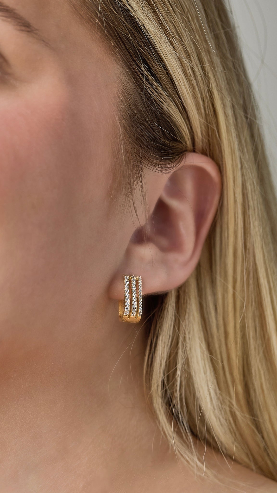 Colette square hoop earrings in three rows of hand set high quality CZ, Gold finish