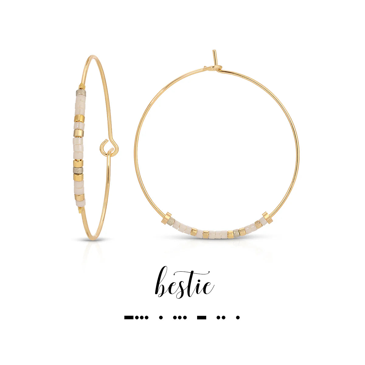 She's your favorite person - the one who laughs when you do and hurts when you're hurting too. Give your bestie these Morse code earrings using alabaster white and pewter glass beads that encode the message in a neutral design she can wear with anything!