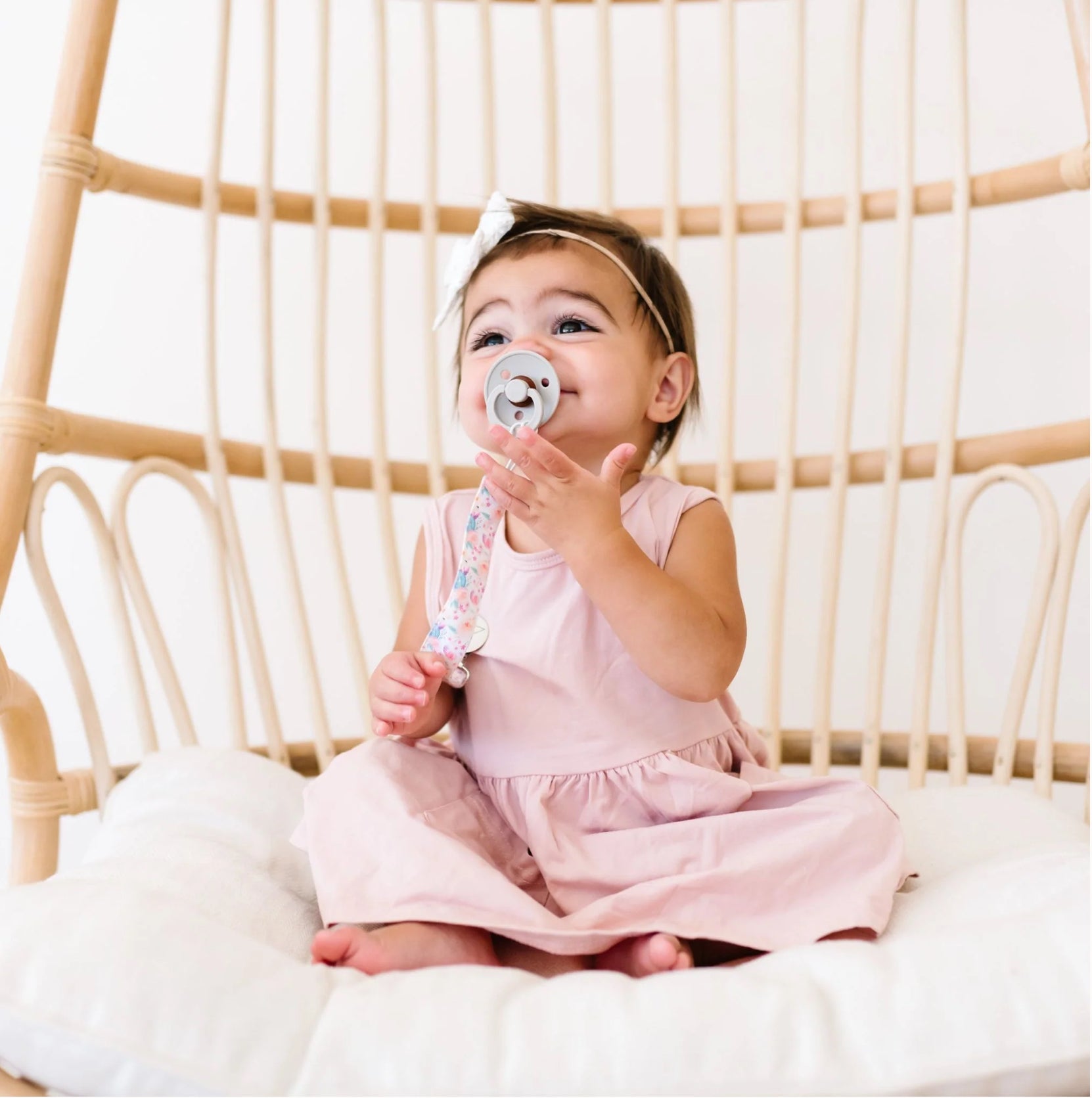 Offering the ultimate blend of fashion and function, our unique Binky Clip features a premium knit strap lined with absorbent fleece to help soak up drool. Simply attach baby's pacifier or teether to one end, then fasten the clip to clothing, blankets or baby gear. Oh, and by the way our set includes three Binky Clips to keep with you wherever you go - no more floor drops or pacifier pick-ups!